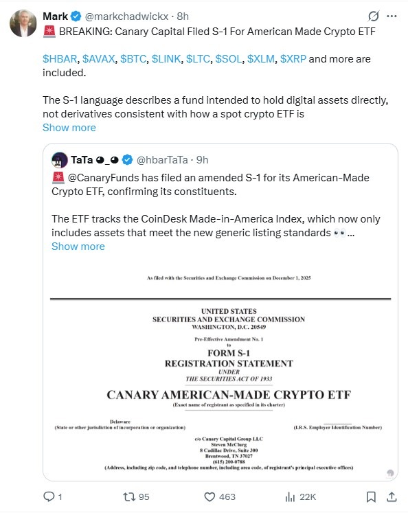 知名投资人和企业家马克·查德威克揭晓X项目进展情况。他指出,Canary Capital已向美国证券交易委员会(SEC)提交了S-1文件。该文件旨在修订其拟推出的美国制造加密货币交易所交易基金(ETF)。
